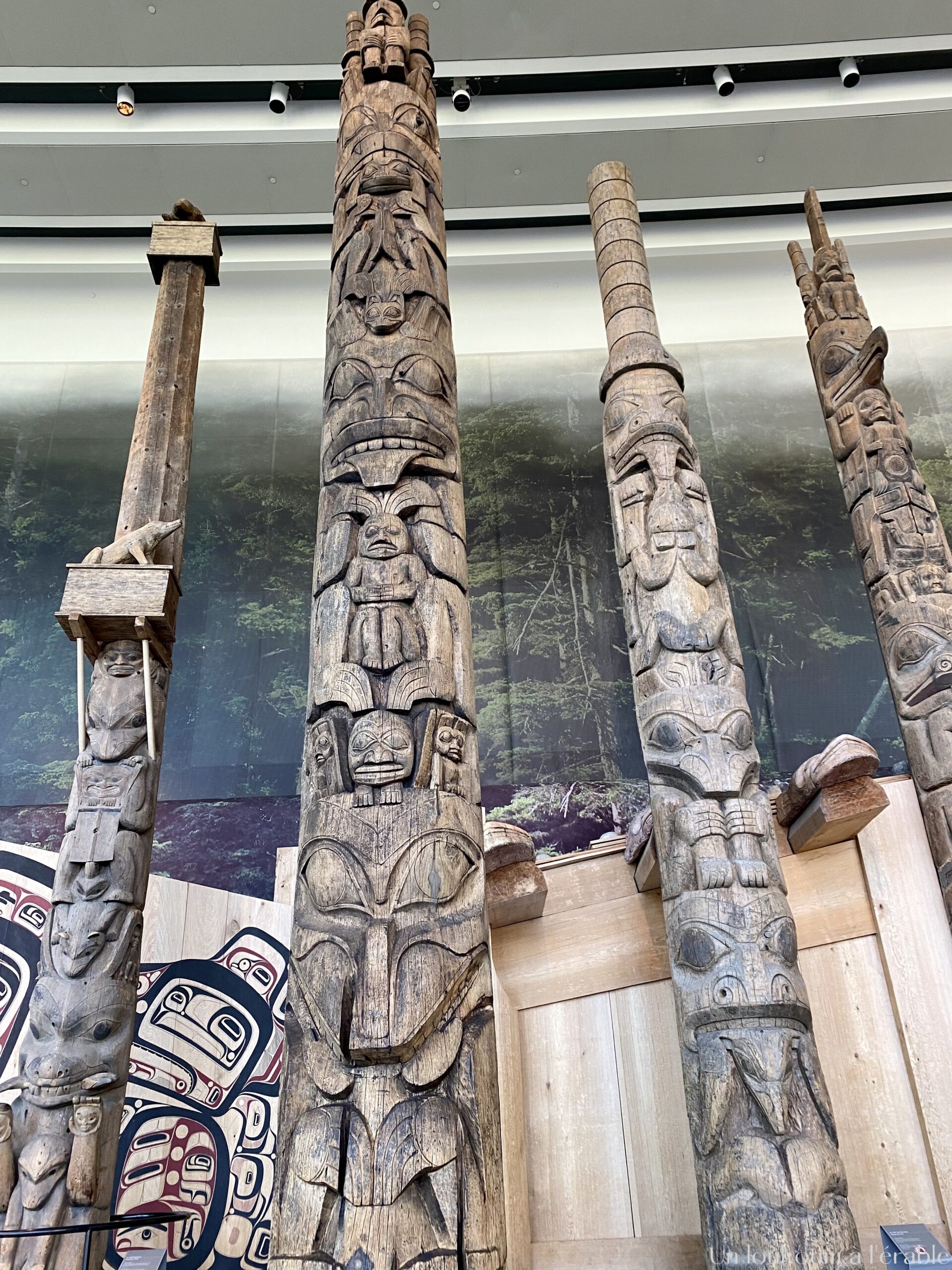 En moins de 2h, c’était difficile de tout voir et nous ratons une partie des expositions. Nous avons tout de même découvert les espaces dédiés aux Premières Nations avec des artefacts, des témoignages et une grande salle où trônent des mâts et des “totems”.